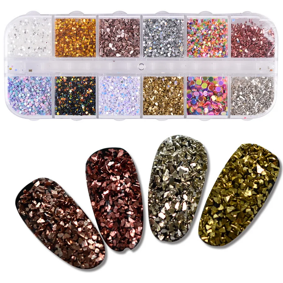 Related Product for 12 grids Mixed Nail Designs AB Color 3D Round Broken Glass Nail Sequins Flakes Champagne/Gold DIY f